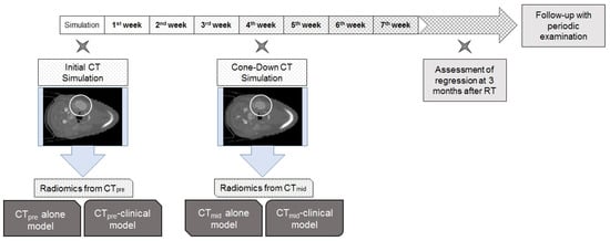 Diagram of the sequence of this study. Initial simulation CT (CTpre) and cone-down simulation CT were acquired prior to RT and in the middle of RT at 4 weeks, respectively. Lymph node within the white circle indicated the region of interest in this study.