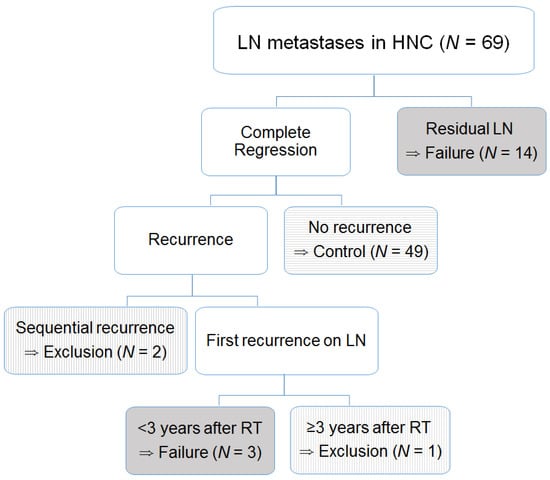 The flow of the selection process for the entire cohort. After excluding sequential recurrence following primary lesion and recurrence over 3 years (vertical line), a total of 17 LN control failures (gray color) were considered in 66 cases for radiomics analyses.