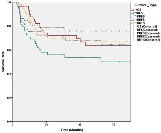 Survival curve of our cohort. OS: overall survival; DFS: disease-free survival; DMFS: distant metastases-free survival; RRFS: regional recurrence-free survival; PRFS: primary recurrence-free survival.