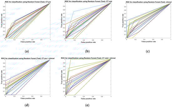 Visualization of receiver operating characteristic (ROC) curves. Each line represents the visualization of an ROC curve during the performance test, with a total of 20 repetitions. Each color line means the outcome of independent performance test. Each figure corresponds to (a) the CTpre alone model, (b) the CTmid alone model, (c) the clinical parameters alone model, (d) the CTpre plus clinical parameters model, and (e) the CTmid plus clinical parameters model.