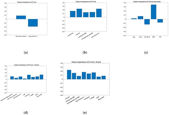 Visualization of the importance of each feature calculated using out-of-bag with a histogram. Each figure corresponds to (a) the CTpre alone model, (b) the CTmid alone model, (c) the clinical parameters alone model, (d) the CTpre plus clinical parameters model, and (e) the CTmid plus clinical parameters model that underwent performance testing using the out-of-bag method.
