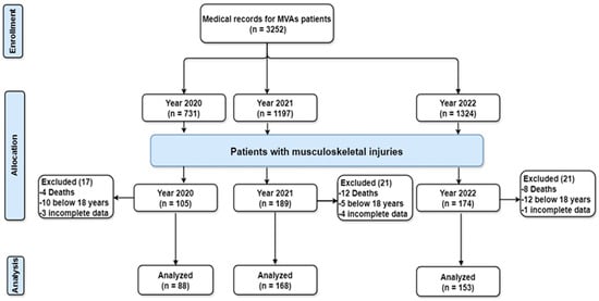 - Alotaibi, F.; Alqahtani, A.H.; Alwadei, A.; Al-Raeh, H.M.; Abusaq, I.; Mufrrih, S.A.; Alqahtani, A.A.; Alsabaani, A.; Alsulami, M.M. Pattern of orthopedic injuries among victims of road traffic accidents in Aseer region, Saudi Arabia. Ann. Med. Surg. 2021, 67, 102509. [Google Scholar] [CrossRef]
