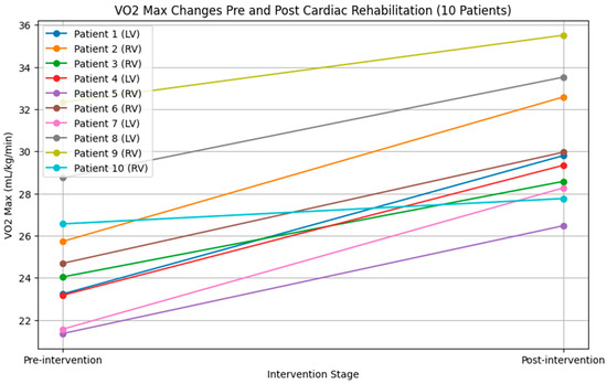 The effect of Cardiac Rehabilitation (CR) on aerobic capacity. This figure illustrates the variation in VO2 Max of the ten Fontan patients before and after participating in the CR program. The plot captures individual trajectories of change in aerobic capacity, as evidenced by the VO2 Max measurements. All patients showed improved VO2 Max after participating in the program. Abbreviations: LV = left systemic ventricle Fontan patient. RV = right systemic ventricle Fontan patient. VO2 max = maximum oxygen consumption.