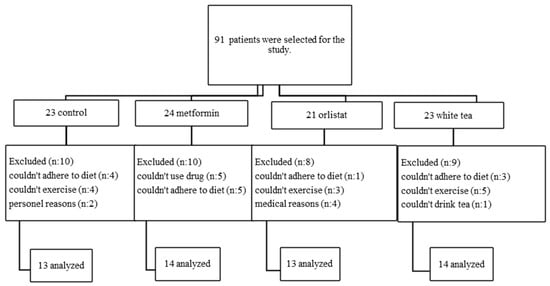 Patients who met the exclusion and inclusion criteria based on anthropometric and biochemical measurements were randomly assigned into 4 groups: control (CONT, 8 females, 5 males), orlistat (ORL, 6 females, 7 males), metformin (METF, 7 females, 7 males) and white tea (WT, 6 females, 8 males). Obese patients with impaired glucose tolerance were given a diet and exercise program and METF. Those with normal glucose tolerance were given a diet and exercise program and ORL. Those who did not prefer medical treatment were given a diet and exercise program and WT. Those who did not prefer medication or WT were given only a diet and exercise program. This study lasted 12 weeks (Figure 1).