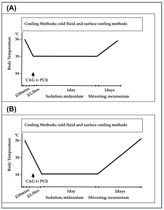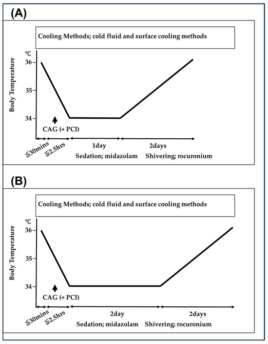 Therapeutic hypothermia protocols from January 2014 to December 2020. CAG indicates coronary angiography; PCI, percutaneous coronary intervention. (A) When the time interval from collapse to the return of spontaneous circulation (ROSC) was within 20 min, we performed the 35 °C targeted core temperature, and the cooling duration was 24 h (Group A). (B) When the interval was not within 20 min, we performed the 34 °C targeted core temperature, and the cooling duration was 24 h (Group B).