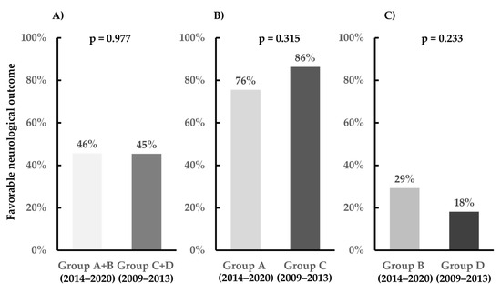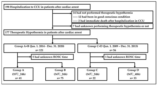 Patients with ROSC following in-hospital cardiac arrest (IHCA) or out-of-hospital cardiac arrest (OHCA) and who received therapeutic hypothermia were included. Patients with a tympanic membrane temperature of <30 °C on ED arrival or who had a noncardiac etiology of cardiac arrest were excluded. Participants were divided into the following two groups according to the era of cardiac arrest: Group A + B and Group C + D. Group A + B comprised patients with cardiac arrest from 1 January 2014 to 31 December 2020, and Group C + D encompassed patients with cardiac arrest from 1 January 2009 to 31 December 2013. Additionally, participants were divided into the following four groups according to the time interval from collapse to ROSC: Groups A, B, C, and D.