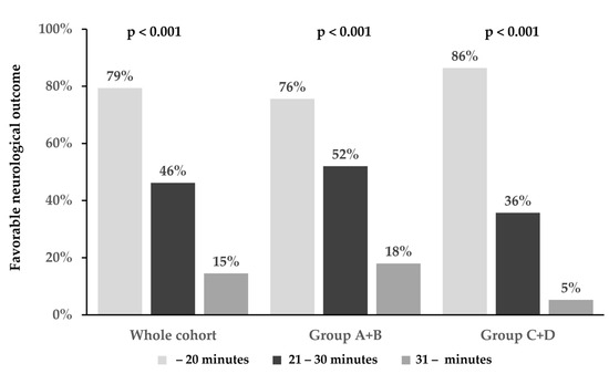 The favorable 30-day neurological outcomes in the subgroups of patients divided into three groups on the basis of the time interval from collapse to ROSC (within 20 min, 21–30 min, and ≥31 min) are shown in Figure 5. In the whole cohort, the favorable 30-day neurological outcome rates following cardiac arrest were 79.4%, 46.2%, and 14.5% in the time intervals of within 20 min, 21–30 min, and ≥31 min, respectively (p < 0.001). In Group A + B, the favorable 30-day neurological outcome rates following cardiac arrest were 75.6%, 52.0%, and 18.0% in the time intervals of within 20 min, 21–30 min, and ≥31 min, respectively (p < 0.001). In Group C + D, the favorable 30-day neurological outcome rates following cardiac arrest were 86.4%, 35.7%, and 5.3% in the time intervals of within 20 min, 21–30 min, and ≥31 min, respectively (p < 0.001).