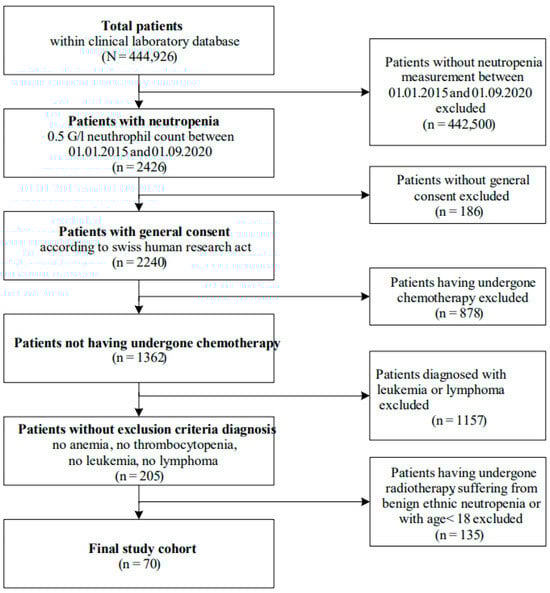 APA StyleNjue, L., Porret, N., Schnegg-Kaufmann, A. S., Varra, L. F., Andres, M., & Rovó, A. (2024). Isolated Severe Neutropenia in Adults, Evaluation of Underlying Causes and Outcomes, Real-World Data Collected over a 5-Year Period in a Tertiary Referral Hospital. Medicina, 60(10), 1576. https://doi.org/10.3390/medicina60101576