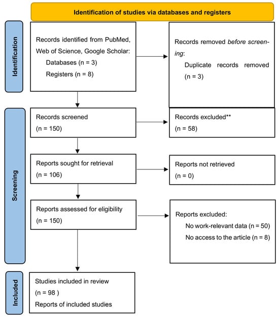 The first search was performed on 10 June 2024, and the search was updated on 3 August 2024, with a final revision on 15 August 2024. In total, 50 original papers, 11 meta-analyses, 13 review papers and guideline papers, etc. were used for the final analysis (Figure 1). Each article was reviewed independently by five researchers (B.P., M.P., I.B., M.P., J.W.) for inclusion according to the inclusion and exclusion criteria that follow. Disagreements regarding article selection were resolved through discussion until consensus was reached or resolved by discussion between authors and project coordinators (K.M., M.W., Ł.D.).