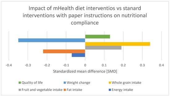 Effect of various mobile health diet interventions vs. standard diet intervention with paper instructions on patient nutritional compliance Standardized mean difference [SMD]. Adapted with permission from Ref. [7].