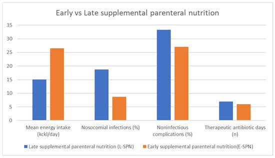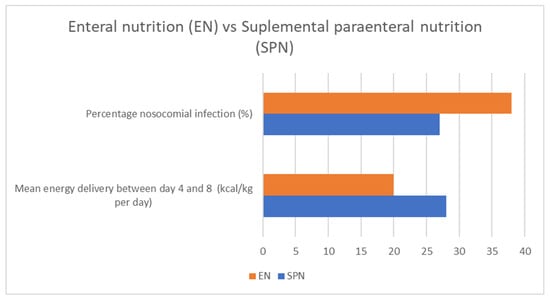 Enteral vs. parenteral food intake and its impact on nosocomial infections and mean energy intake. Adapted with permission from Ref. [35].
