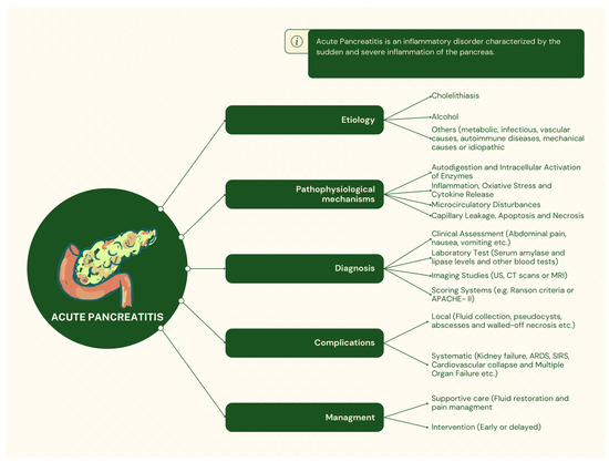 The etiology involves a wide range of causative factors. The most common of these are cholelithiasis and alcohol. However, AP can also arise from various other causes, including metabolic, infectious, and vascular factors, as well as autoimmune diseases and other underlying conditions. When the cause of AP cannot be identified, then it is called idiopathic [5,6,7]. The underlying etiology of AP serves as the determinant for the ensuing pathophysiological mechanisms [8,9].