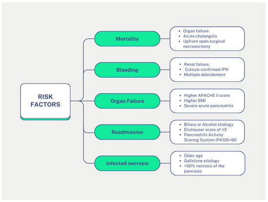 There are many prognostic factors concerning the development of ANP or its appearance in the first stage (Figure 4). More specifically, in cases of ANP, factors such as advanced age, the presence of shock, and a high APACHE II score appear to be significant predictors of mortality. Additionally, a prolonged hospital stay is also associated with an increased risk of mortality [88]. A high APACHE II score appears to significantly influence the likelihood of organ failure, alongside the patient’s body weight and the severity of ANP [88]. The severity of ANP seems to be caused by a variety of factors; these initially include the laboratory findings, which include high levels of haematocrit, C-reactive protein, blood urea nitrogen/creatinine, cytokines, and others. Also, the depicted findings can contribute as prognostic factors, specifically a CT scan, which discloses and quantifies the degree of pancreatic parenchyma necrosis. Finally, there are many classification systems for AP, such as the APACHE II and the Ranson score [89]. In patients who underwent endoscopic necrosectomy, the occurrence of bleeding seems to be predicted by factors such as renal failure, culture-confirmed infectious pancreatic necrosis, and multiple debridement procedures [90].