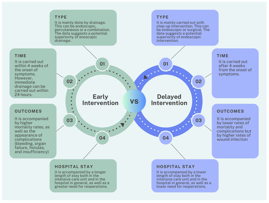 Due to the poorer primary and secondary outcomes associated with early intervention, it should only be selected when there are appropriate indications. These concern the occurrence of serious complications during the first four weeks due to systemic inflammation [84]. This systemic inflammation, driven by the release of numerous enzymes and inflammatory cytokines, can exacerbate the patient’s condition, leading to new-onset organ failure or the worsening of pre-existing organ failure, among other complications [85]. Additionally, in some patients, complete encapsulation of the necrotic pancreatic collection may occur within the first three weeks, rendering any delay in treatment unnecessary [86,87]. Moreover, in these patient categories, early intervention does not appear to result in higher complication rates or greater mortality compared to delayed intervention [41].