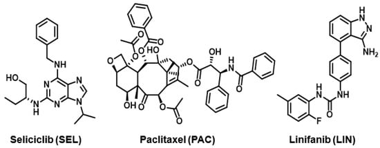 PAC has been approved as a first-line treatment for numerous types of cancer, such as breast, ovarian, gastric, and non-small cell lung cancer, as well as Kaposi sarcoma [13]. It inhibits cell replication during the mitotic phase of cell division by binding to tubulin, promoting the polymerization of the tubulin dimers, and subsequently stabilizing microtubules. Furthermore, PAC induces apoptosis in cancer cells by binding to the Bcl-2 protein, distorting mitotic spindles and leading to chromosome fragmentation [14,15]. On the other hand, the SEL drug displays a high efficiency and selectively inhibits CDK 2, 7, and 9 at their ATP binding sites [16,17]. SEL’s antiproliferative and apoptotic effects are controlled by several molecular mechanisms, including the inhibition of RNA polymerase II-dependent transcription, the downregulation of proliferative and survival proteins, the upregulation of p53, the decrease in Rb phosphorylation, and the modulation of E2F transcriptional activity [5,18,19].
