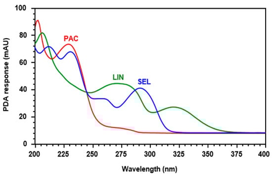 The UV absorption spectra of SEL, PAC, and LIN. These spectra were generated by the PDA detector of the HPLC system. The concentrations of SEL, PAC, and LIN solutions were 50, 10, and 100 µg mL−1, respectively.