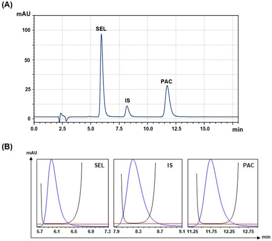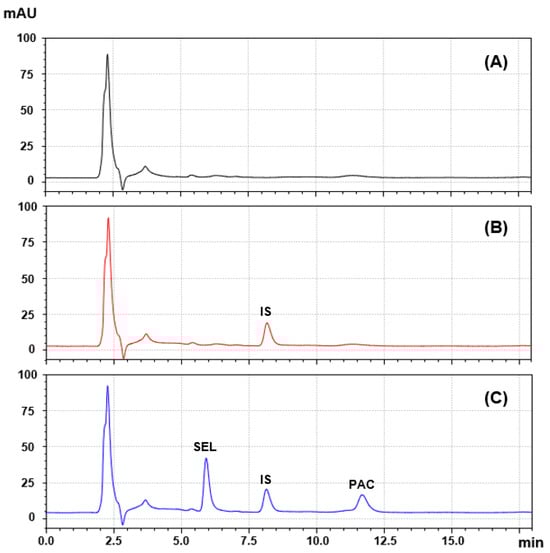 Representative chromatograms of blank (drug-free) human plasma (A), plasma spiked with IS at a concentration of 10 µg mL−1 (B), plasma spiked with IS, SEL, and PAC at concentrations of 10, 25, and 25 µg mL−1, respectively (C).