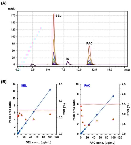 Panel (A): Overlaid chromatograms of standard solutions containing varying concentrations (0.78–100 µg mL−1) of SEL and PAC. All solutions contained a fixed concentration of IS (10 µg mL−1). Panel (B): the calibration curves (●, on the left axis) and precision profiles, expressed as RSD % (▲, on the right axis), of the HPLC-PDA method for the simultaneous determination of SEL and PAC.