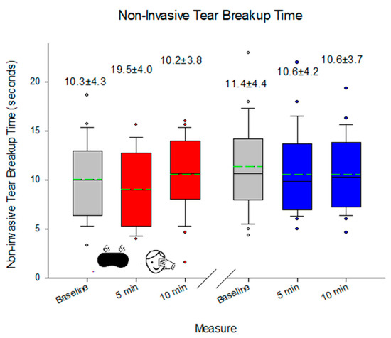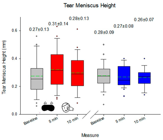 - Olson, M.C.; Korb, D.R.; Greiner, J.V. Increase in tear film lipid layer thickness following treatment with warm compresses in patients with meibomian gland dysfunction. Eye Contact Lens 2003, 29, 96–99. [Google Scholar] [CrossRef]