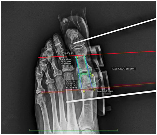 Fluoroscopic verification will confirm if the osteotomies are properly aligned with the anatomical landmarks of the first ray, as the aluminum wire should align with the interarticular line of the first metatarsophalangeal joint. The Akin and Reverdin osteotomies must be parallel to the metatarsophalangeal joint line and located 1.6 cm away from it.