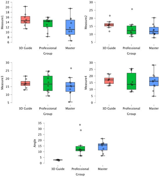 It can be observed that the 3D Guide group consistently exhibits lower dispersion across all measures, indicating greater consistency in its results. In contrast, the Professionals and Master’s students groups show greater variability, particularly in the Angle measure, where more pronounced differences between the groups are evident.