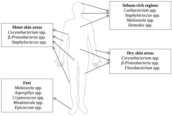 Compared to the colon, which, given its richness in nutrients, harbors the highest density and diversity of microorganisms, being colonized by approximately 1014 bacterial cells [26] comprising circa 3000 species [27,28], the skin’s commensal flora is less abundant, but remarkably diverse, counting over 100 phylotypes [29]. It comprises not only skin-resident aerobic and anaerobic Gram-positive bacteria (mainly Corynebacterium spp., Cutibacterium spp., Streptococcus spp., Staphylococcus spp., Actinobacteria spp., and Firmicutes spp.) and Gram-negative facultative or obligate anaerobic bacteria (primarily Proteobacteria spp. and Bacteroidetes spp.), but also bacterial species characteristic to the gut microbiome, such as Escherichia spp., Enterobacter spp., and Enterococcus spp. [29,30,31,32]. The distribution of the commensal flora varies depending on the local conditions, being greatly influenced by the skin’s humidity, temperature, lipid content, and light exposure (Figure 1) [24]. While Corynebacterium spp. and β-Proteobacteria spp. colonize both moist and dry skin areas, Staphylococcus spp. preferentially colonizes moist and sebum-rich regions, Flavobacterium spp. is predominately isolated from dry regions and Cutibacterium spp. is present in higher numbers in areas rich in sebaceous glands [33,34]. Fungi are also an important part of the skin microbiome. Malassezia spp. abounds in sebum-rich areas [35], whereas the skin of the feet is populated by a variety of fungi, such as Malassezia spp., Aspergillus spp., Cryptococcus spp., Rhodotorula spp., and Epicoccum spp., given the favorable local conditions [35]. Pilosebaceous units are also colonized by Demodex spp., a commensal arthropod generally detected on the face and scalp [36,37,38]. Viruses such as human papilloma virus (HPV), particularly Papillomaviridae β, Polyomaviridae, and Circoviridae, are a less prominent part of the skin microbiome [33,39].