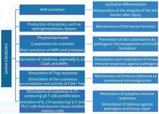A balanced skin microbiome is essential for maintaining an efficient skin barrier, as it intervenes in a plethora of physical, chemical, and immunological processes (Figure 2) [51,52]. Metabolites of the commensal bacteria activate the aryl hydrocarbon receptor (AHR) expressed by keratinocytes, which is essential for epithelial differentiation and restauration of the integrity of the skin barrier after injury [53]. Commensal bacteria also secrete enzymes with important roles in the maintenance of the barrier function. Staphylococcus epidermidis secretes sphingomyelinase, which generates ceramides, an important part of the stratum corneum lipid bilayer and at the same time releases nutrients that sustain the microbiome [54]. Lipophilic bacteria like Cutibacterium acnes and Corynebacterium spp. produce lipases that act on triglycerides present in the sebum, the resultant free fatty acids contributing to the skin’s acidity, an important antimicrobial factor [55,56]. Moreover, the microbiome blocks the colonization of the skin by pathogenic microorganisms, acting as a physical barricade, as a competitor for nutrients, and a major producer of AMPs and proteases that hinder biofilm formation and impede skin colonization [57].