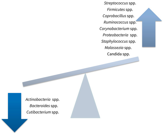 Considering the delicate equilibrium between the host and the skin microbiome and the importance of the latter in maintaining skin homeostasis, it is not surprising that even subtle disturbances of the microbiome may trigger the onset or exacerbation of local or systemic inflammatory and autoimmune diseases, such as psoriasis, atopic dermatitis, acne vulgaris, hidradenitis suppurativa, seborrheic dermatitis, and alopecia areata [19]. The underlying mechanisms are only starting to be unveiled. They include loss of immune tolerance to commensal skin flora, disrupted balance between Tregs and effector cells, and excessive Th17 polarization [19,24].