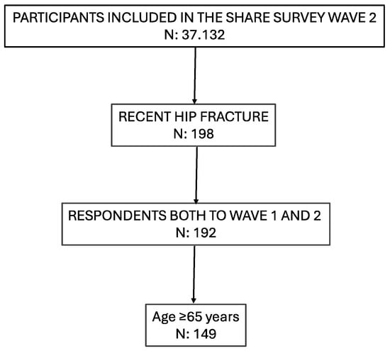 In the second wave of the SHARE study, from the 37,132 participants that responded to the survey, we identified 149 participants with an age ≥ 65 years who had suffered a hip fracture between the first and the second wave and for which information on the PHS at baseline was available (Figure 1).