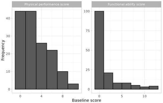 The distribution of the physical performance and functional ability scores are reported in Figure 2, and the mean values were 3.3 and 1.9, respectively.
