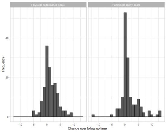 Distribution of the changes over follow-up time of the physical performance and functional ability scores.