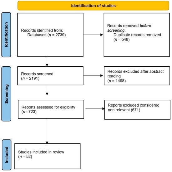 The search initially identified 2739 titles (956 “nystagmus”, 446 “peripheral vestibular disorders”, 1114 “ocular movements”, 135 “ocular movements nystagmus”, 88 “peripheral vestibular disorders nystagmus”). After removing duplicates, 2191 unique titles remained. Abstracts were then reviewed, leading to the exclusion of 1468 titles. Papers without abstracts were not considered. Further evaluation of the remaining abstracts allowed for the exclusion of clinically irrelevant articles according to the established criteria. The relevant abstracts were subsequently assessed in full, resulting in 52 articles that were read in their entirety. The search results were evaluated by two groups of independent reviewers who evaluated the quality and relevance of each study. Any disagreements were resolved by consensus, and when necessary, a third reviewer was consulted in order to limit possible bias. We used a flowchart to organize the literature (see Figure 1). We have to state that this is not a systematic review because it was not possible to analyze the literature on this topic from a statistical point of view. Due to the heterogeneity of study designs and diagnostic tools, a systematic review was not feasible. Additionally, some studies lacked standardized reporting, further complicating a systematic approach.