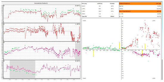 Caloric nystagmus is a type of nystagmus elicited by a thermal stimulation of the vestibular end organ. In fact, it relies only on the stimulation of the lateral semicircular canal. Types of nystagmus are compared in caloric tests with air at 50 °C and 24 °C and with water at 44 °C and 30 °C. This test was described for the first time by Barany, an Austrian physician who won in 1914 the Nobel prize for this discovery [26]. The physiological explanation of this nystagmus is based on the fact that thermal stimulation induces a convection endolymphatic flow in the lateral semicircular canal, ampulopethal in the cold stimulation and ampulofugal in the cold stimulation. These convection currents deflect the ampullary crest thus triggering an action potential of this sensory receptor. This initiates the vestibulo-ocular reflex (VOR) generating the vestibular nystagmus. The warm water irrigation induces a slow movement of the eyes away from the side of the stimulus followed by a corrective fast saccade towards the side of the stimulus. The opposite happens with cold water irrigation. The vestibular response is calculated using the Jongkee formula [27]. Even though this physiological mechanism is accepted by the medical community there are aspects that cannot be explained. In an article published in 2019 Bell gives the hypothesis that maybe caloric response is in fact a response intermediated by the middle ear muscles, but the vestibular system has to be intact in order to register a positive response [28]. In Figure 3, we present the result of an oculography showing a right caloric areflexia.