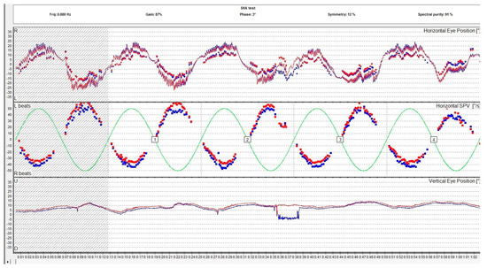 Per- and post-rotational nystagmus of the head is another type of physiologic nystagmus. Although the specialized literature does not distinguish the two denominations, rotational nystagmus (a per-rotational or post-rotational nystagmus which is a horizontal nystagmus) should be differentiated from the form of rotatory nystagmus which is in fact a torsional nystagmus. In normal conditions, the vestibulo-ocular reflex (VOR) causes a tonic eye deviation, opposite to the head turn, designed to maintain fixation on an object. This action is counteracted by the saccades that originate from the frontal eye field in the opposite direction, which results in the fast component of the horizontal nystagmus as observed during rotations. This type of nystagmus is examined with a rotary chair. The rotational chair was introduced by Barany in 1907, and nowadays the ocular movements during rotation are registered using oculography and it is a part of the VNG testing along with the caloric and positional tests. Rotary chair testing has significantly evolved since it was first introduced and other rotational tests emerged. Nowadays, the battery of rotational tests includes sinusoidal testing, after-kinetic nystagmus, visual–vestibular interaction, and off-vertical axis rotation. Rotational tests evaluate both lateral semicircular canals at the same time. The rotary chair commonly evaluates frequencies in the range of 0.01–1.28 Hz. Gain, phase, and symmetry are the parameters used to assess the rotational nystagmus. Gain is the ratio of the amplitude of slow phase velocity of the rotational nystagmus to the amplitude of head movement. Phase is a parameter that describes the relationship between head movement and eye response. In Figure 4, we present the VNG graph of a sinusoidal pendular stimulation test, a rotational test used to assess the vestibular system.
