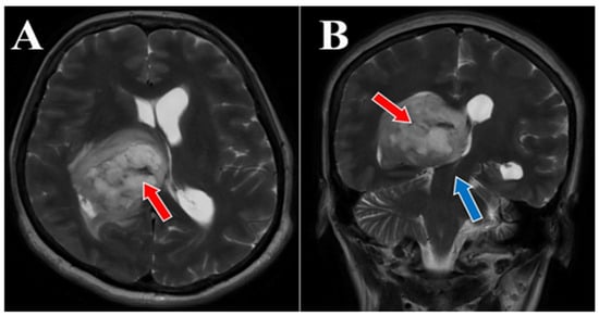 Preoperative MRI T2 sequence, axial and coronal section. MRI T2-sequence axial section (A) and coronal section (B) both depict a thalamic glioma with various morphological aspects (red arrows) with marked mass effect on the third ventricle (blue arrow). The hyperintensity on T2-weighted images with heterogeneous and subtle enhancement following the administration of gadolinium DTPA exhibits an infiltrative nature suggestive of a high-grade glioma. The glioma measured 5.5 × 6 cm, associated with a significant midline shift of around 1 cm.