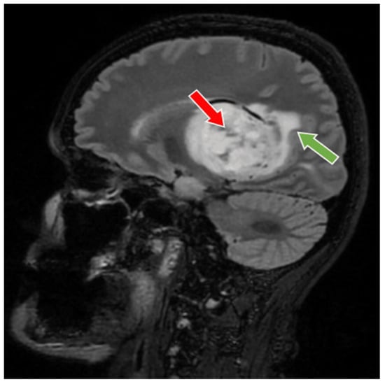 Preoperative MRI T2-FLAIR sequence, sagital section. MRI T2-FLAIR sequence sagital section depict a thalamic glioma (red arrow), with an infiltrative character suggestive of a high-grade glioma (green arrow). The glioma has a diameter of 6 cm.