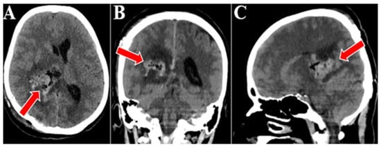 Postoperative CT scan, all three sequences, axial (A), coronal (B), and sagital (C). Postoperative CT scan that confirmed the gross total resection of the tumor, an area of right thalamic hypodensity and right deep parietal of sequelae aspect (red arrows).