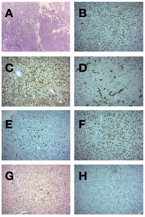- Louis, D.N.; Perry, A.; Wesseling, P.; Brat, D.J.; Cree, I.A.; Figarella-Branger, D.; Hawkins, C.; Ng, H.K.; Pfister, S.M.; Reifenberger, G.; et al. The 2021 WHO Classification of Tumors of the Central Nervous System: A summary. Neuro-Oncol. 2021, 23, 1231–1251. [Google Scholar] [CrossRef]