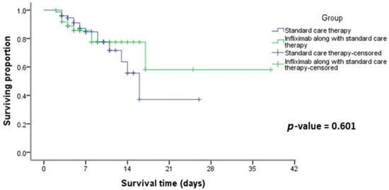 A comprehensive observation of patients from the time of admission until their discharge and the total number of deaths were reported. Upon analysis, no statistical significance was found in survival rates between patients receiving Infliximab plus standard care and those receiving standard care alone (p = 0.601), as shown in Figure 1.