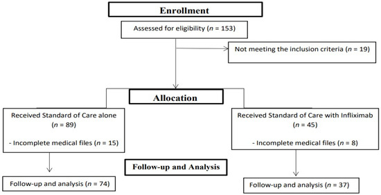 A retrospective analysis was undertaken on medical files of COVID-19 patients who were hospitalized at the Teachers’ Hospitals in Cairo, Egypt, between December 2020 and June 2022. The Research Ethics Board of the Faculty of Pharmacy, October 6 University granted approval for this study with the number PRC-Ph-2407001, ensuring compliance with the Declaration of Helsinki. The scope of our study encompassed two cohorts of hospitalized COVID-19 patients with moderate to severe symptoms. The control group (n = 74) received standard care therapy, whereas the intervention Group (n = 37) was given Infliximab along with standard of care, Figure 2.