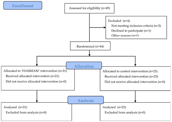 Forty-four women met the inclusion and exclusion criteria and were randomly assigned to the ‘HAMMAM’ (n = 21) or control groups (n = 23) (Figure 1). The sociodemographic and clinical characteristics of the study population are summarized in Table 1, while the study outcome scores at baseline are depicted in Table 2. As shown, there were no between-group differences in the sociodemographic or clinical characteristics, nor in the study variables at baseline. All participants attended all of the three prescribed sessions, representing an adherence rate of 100.0%. None of the participants reported any remarkable health problems during the trial. The mean satisfaction with the ‘HAMMAM’ program, evaluated by an NRS at the end of the intervention, was 9.71 ± 0.46 out of 10.