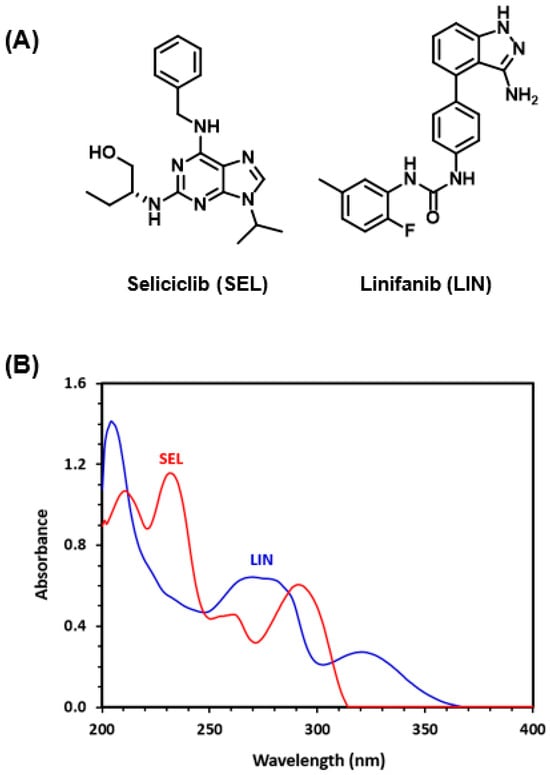 The chemical structures and abbreviations of seliciclib and linifanib (A), and the UV absorption spectra of their methanolic solutions (B). The concentrations of these solutions were 20 and 10 µg mL−1 for SEL and LIN, respectively.