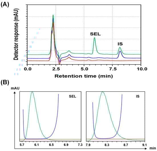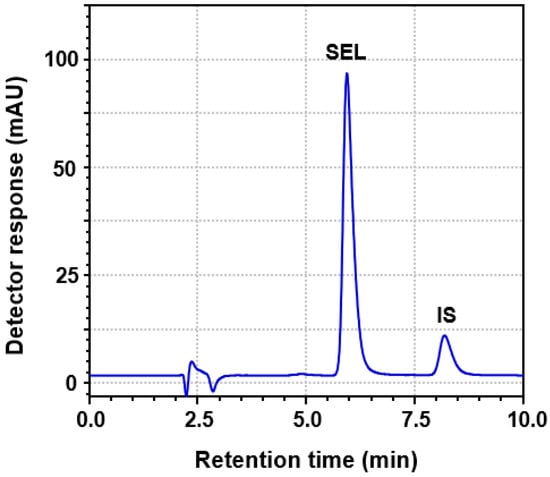 To select the most appropriate column packing and dimensions, other reversed-phase columns including phenyl columns (250 mm length × 4.6 mm i.d., 5 μm particle diameter; manufactured by Phenomenex Inc. (Torrance, CA, USA) and Nucleosil CN (250 mm length × 4.6 mm i.d., 5 µm particle diameter) manufactured by Macherey-Nagel GmbH & Co. (Düren, Germany) were tested. The results demonstrated that Zorbax Eclipse Plus C18-column (250 mm length × 3.9 mm i.d., 5 μm particle diameter) was the best column, and thus, it was selected for all the subsequent work. Under these conditions, a good resolution between SEL and IS was achieved within a reasonably short run time (10 min); SEL and IS were eluted as sharp, narrow, symmetric peaks at 5.97 and 8.23 min, respectively (Figure 2). The system suitability parameters (capacity factor, separation factor, resolution factor, peak symmetry factor, and the number of theoretical plates) were measured, and the results are given in Table 1.