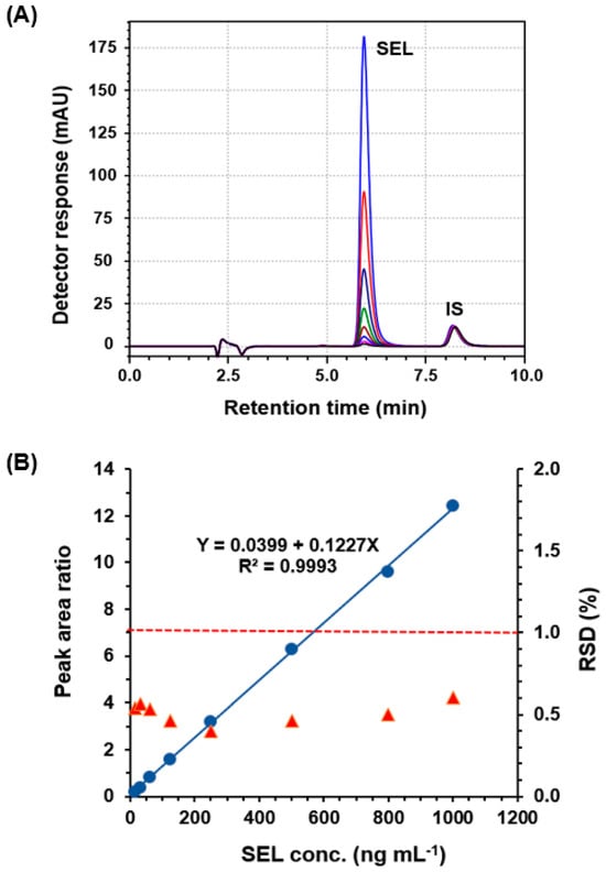 Panel (A): Overlaid chromatograms of standard solutions containing varying concentrations (50–1000 ng mL−1) of SEL and a fixed concentration of IS (100 ng mL−1). Panel (B): the calibration curve (Blue circles, ●; on the left axis) and precision profile, expressed as RSD, % (red triangles, ▲; on the right axis) of the HPLC-PDA method for the determination of SEL.