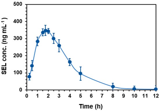 The proposed HPLC-PDA method was employed for the quantification of SEL in plasma samples obtained from rats after their oral administration with SEL at a dose of 25 mg/kg. Rats were selected in this study because they were proved to be the most appropriate animal model for studying human biology due to their high degree of genomic and physiologic similarities to humans []. The mean plasma concentration (in ng mL−1) versus time (h) profile of SEL in rats is shown in Figure 5, and the main pharmacokinetic parameters explored are summarized in Table 6.