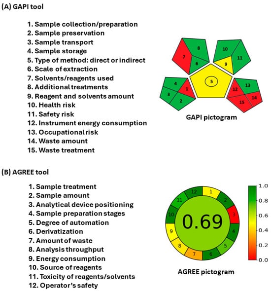 The AGREE tool (v 0.5 beta) is user-friendly software that assesses the environmental sustainability of analytical methods based on the 12 principles of Green Analytical Chemistry (GAC). The results are automatically presented in a circular pictogram format, with each segment color-coded from deep green (=1) to deep red (=0) based on its impact on assay sustainability. The total score displayed at the pictogram’s center is computed as a fraction of unity.