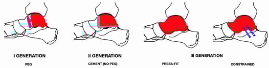 - Abramson, M.; Hilton, T.; Hosking, K.; Campbell, N.; Dey, R.; McCollum, G. Total talar replacements short-medium term case series, South Africa 2019. J. Foot Ankle Surg. 2021, 60, 182–186. [Google Scholar] [CrossRef]