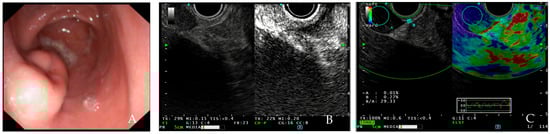 (A) EUS showing GIST in the antrum of stomach; (B) GIST in contrast-enhanced endoscopic ultrasound showing hypervascularization and displaying inhomogeneous contrast-uptake; (C) elastography of GIST located in the duodenum showing blue pattern. [source Division of Gastroenterology and Digestive Endoscopy, Humanitas Research Hospital—IRCCS, Rozzano, Milan].
