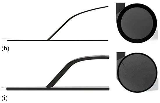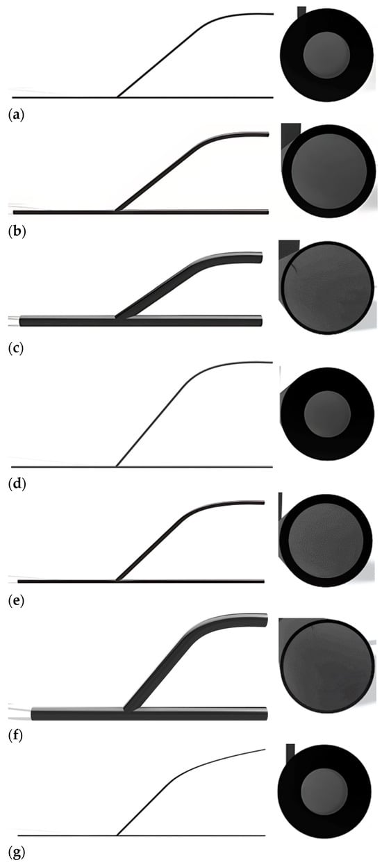 The AV graft’s geometrical representations were generated using Autodesk Fusion 360. This experiment used an end-to-side (ETS) graft anastomosis with varied tube diameters across many sites. The sizes are determined based on three specific locations: the radio cephalic, brachioradialis, and brachiocephalic veins. The graft and host artery diameters were fixed at 2 mm, 5.1 mm, and 14.5 mm, respectively. The graft length remained constant at 250 mm for all anastomosis angles depicted in Figure 2. Each version was designed with a consistent inner diameter section thickness of 0.5 mm. A sectional analysis was conducted to expose the internal details of the design and eliminate any portions that may block blood flow between the heel and toe along the vein.