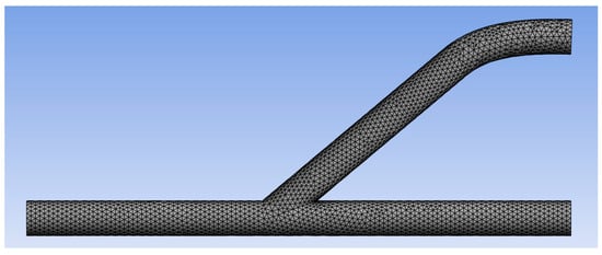 A CFD analysis was conducted to determine the most suitable diameter and anastomosis angle, observed wall shear stress (WSS) and turbulence intensity alterations, and appropriate placement for AV graft implantation. Initially, a mesh was generated using the ANSYS fluid flow (fluent) meshing program. All nine AV graft models were composed of fine and tetrahedral core components in the mesh. The objective of this meshing strategy was to provide a refined mesh that accurately captures the physics of the model, ensuring precision, numerical stability, and efficient computing time for CFD simulations [16]. Additionally, mesh boundaries were established for the model to define the inlet (velocity), outlet (pressure), and wall conditions. Figure 3 shows a mesh of the model for a 14.5 mm at 40° graft. A triangular mesh is utilized in the model, which is a program-controlled option in the software.